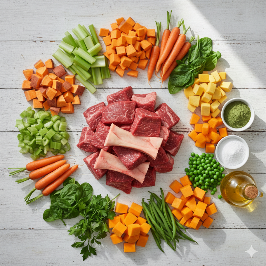 Beef Chuck (muscle meat), Sweet Potato, Carrots, Marrow Bones (simmered for collagen, removed before packing), Celery, Pumpkin, Peas, Butternut, Spinach, Green Beans, Hemp Protein Powder, Olive Oil, Sunflower Oil, Egg Shell Powder, Parsley
