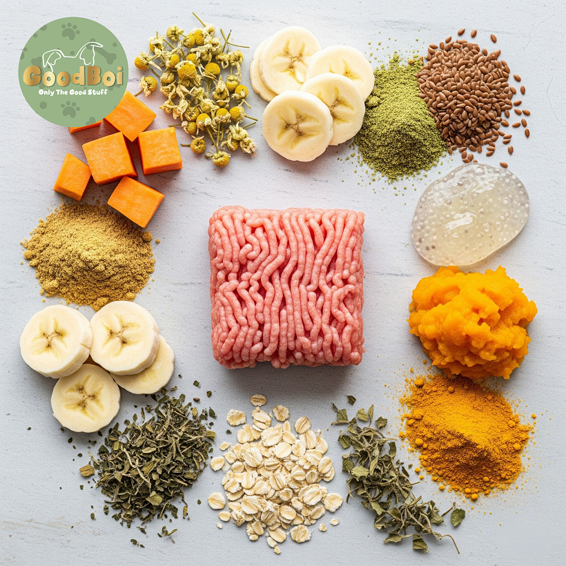 Event Anxiety: Bone broth (or water), cooked chicken breast, pumpkin, sweet potato, banana, chicken fat, ground flaxseed, chia seed gel (chia seeds, water), chamomile infusion, lemon balm infusion, passionflower infusion, ginger, turmeric